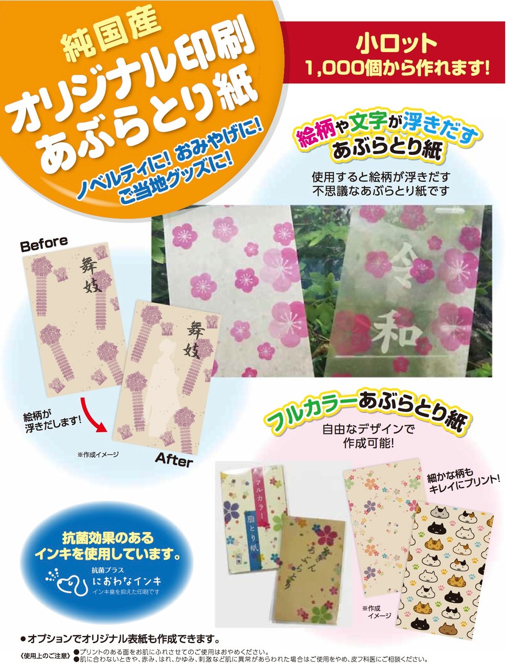 特殊インクにより、文字や絵柄が浮き出るあぶらとり紙です。